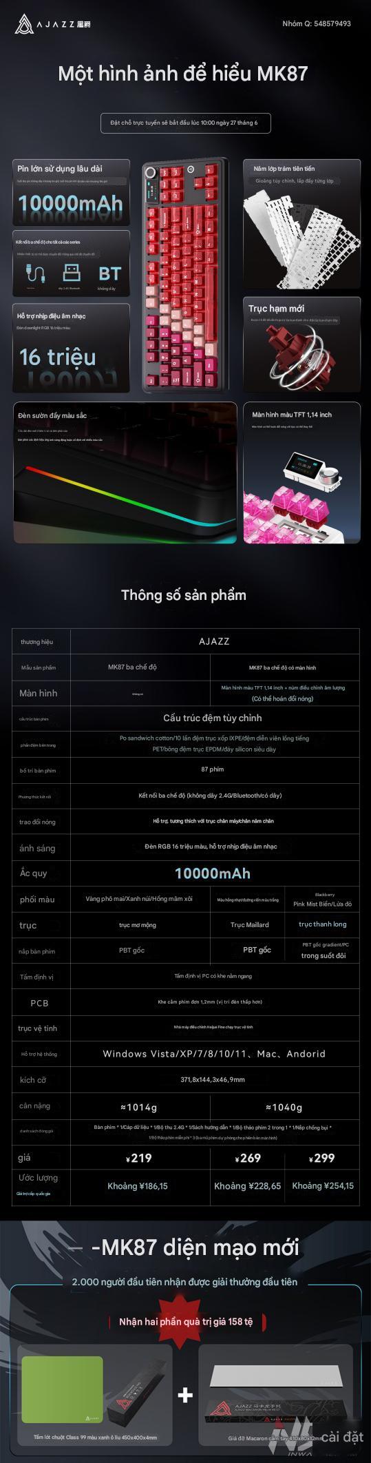 Nếu bạn cần layout gọn, âm êm, chơi được cả game lẫn gõ văn bản và thích vọc vạch, AJAZZ MK87 là “chuẩn đáp án” 87 phím trong tầm giá. Đặt lịch 20 h 02/07 để không bỏ lỡ combo quà tặng!