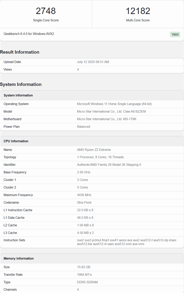 Sau nhiều dò dỉ, AMD Ryzen Z2 Extreme (Zen 5) vừa xuất hiện trong cơ sở dữ liệu Geekbench 6 qua mẫu MSI Claw A8 (RAM 24 GB LPDDR5X). Đây là lần đầu cộng đồng được chứng kiến sức mạnh thực tế của SoC handheld cao cấp nhất 2025.