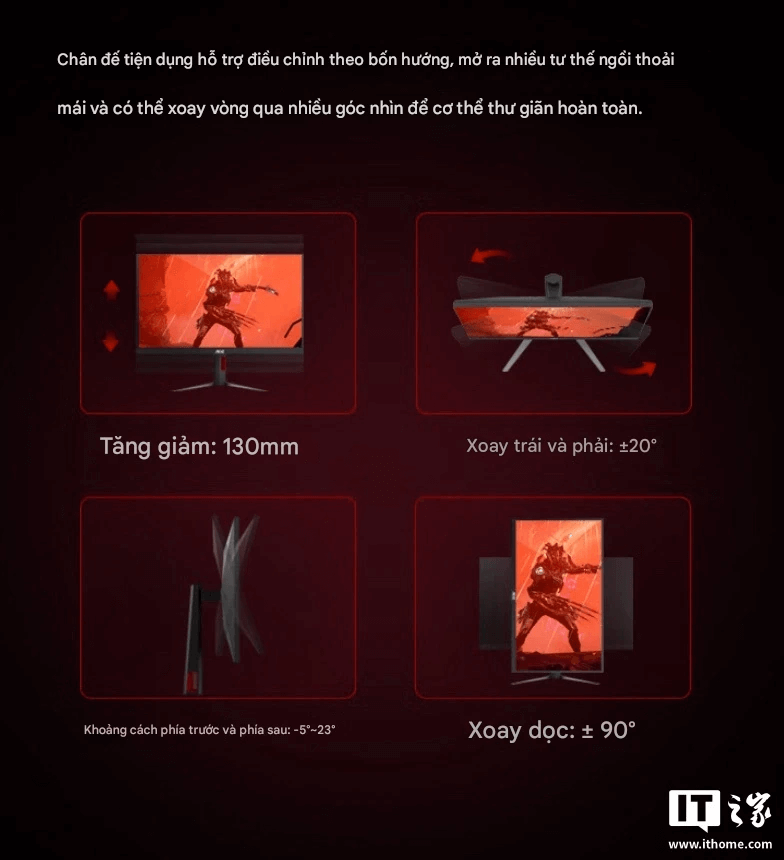 Chân đế đi kèm hỗ trợ nâng hạ độ cao, xoay dọc – ngang, ngả trước / sau. Nếu cần không gian gọn gàng, người dùng có thể tháo chân và gắn VESA 100 × 100 mm lên arm hoặc giá treo.