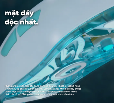 Không nhàm chán như các hãng gaming gear chỉ khoét lỗ, cắt bỏ hoặc làm từ những chất liệu mỏng manh, Lamzu Atlantis Mini biến đáy chuột thành một tác phẩm nghệ thuật với vật liệu polycarbonate với nhiều phần cắt xẻ mô phỏng theo những cơn sóng từ Atlantis sâu thẳm, tăng độ thẩm mỹ cho một sản phẩm vốn không mang nhiều tính nghệ thuật, tạo cảm hứng cho không gian của bạn.