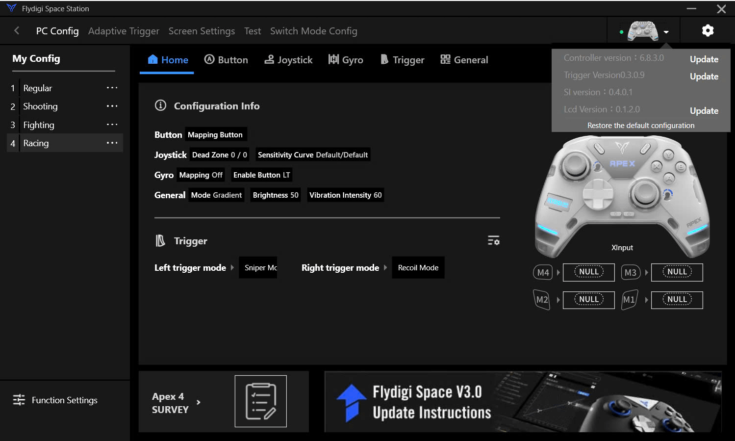Apex 4 được khen nhờ ứng dụng Flydigi Space Station: remap, RGB, macro, màn hình, tension stick, force trigger… Apex 5 tiếp tục dùng nền tảng này nhưng: