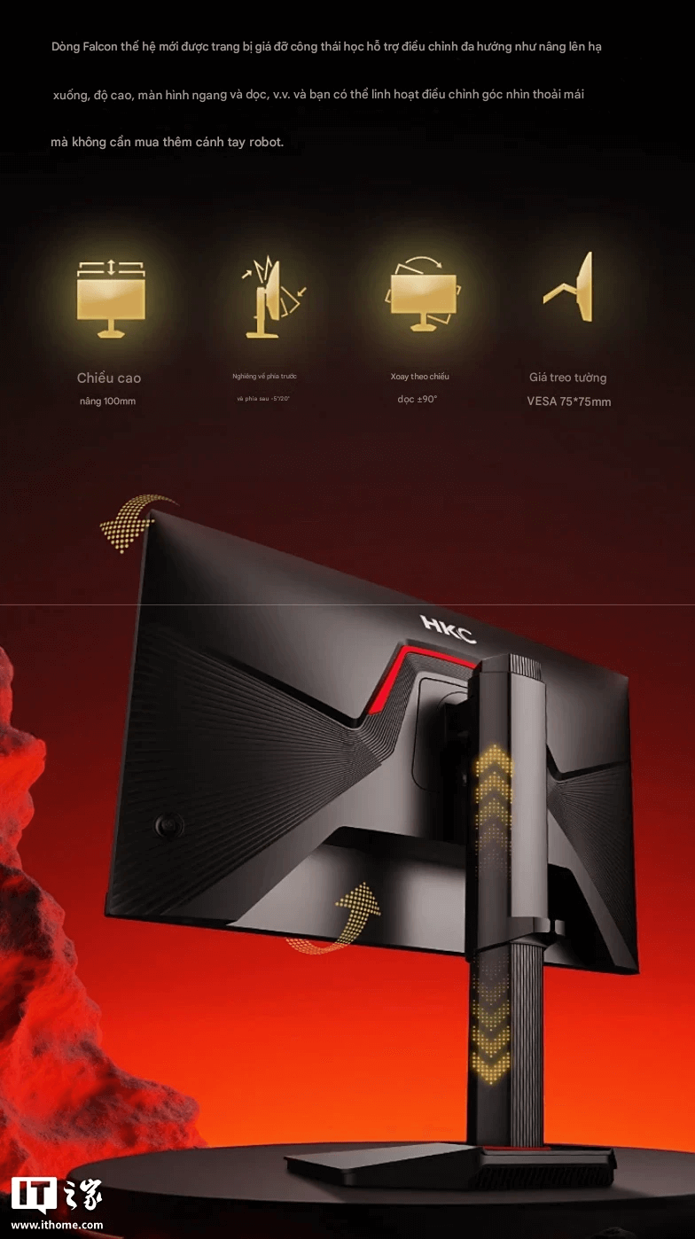 Chân đế hỗ trợ nâng hạ, xoay dọc, ngả trước / sau; VESA 75 × 75 mm cho người muốn gắn arm, tiết kiệm diện tích bàn.