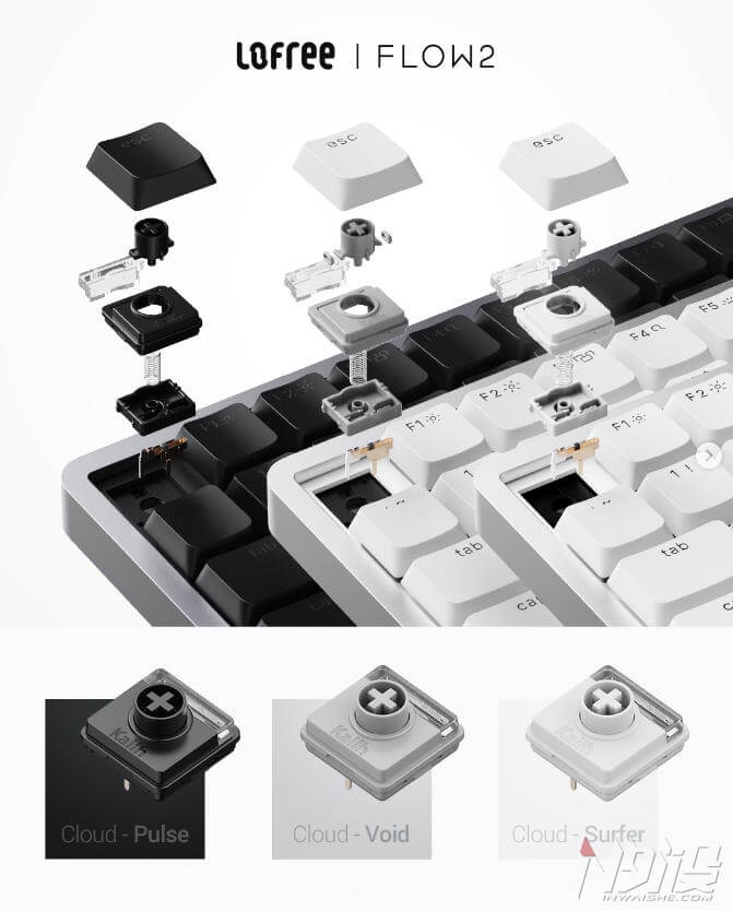 Flow2 áp dụng Gasket mount + foam nhiều tầng để giảm ồn, tạo cảm giác gõ mềm. PCB hot-swap tương thích low-profile, kèm 3 option Kailh custom (tuyến tính/tactile/clicky) cho từng nhu cầu.