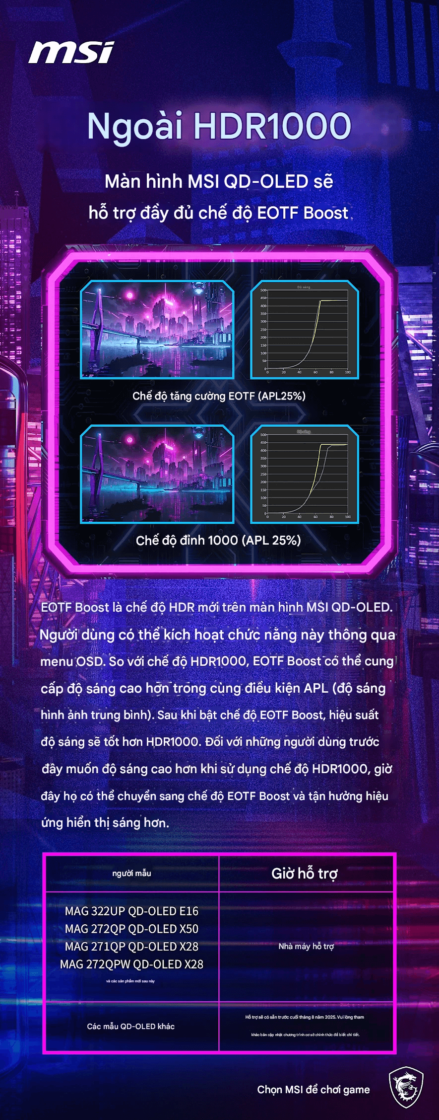 Lộ trình cập nhật: Các mẫu QD-OLED còn lại sẽ nhận firmware EOTF Boost trước 31/08/2025, người dùng tải tại trang hỗ trợ sản phẩm MSI.