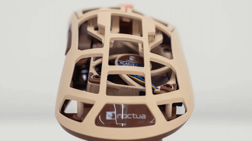 Về kiểu dáng, bản Feinmann gốc nặng chỉ 46 g nhờ khung hợp kim magie và thiết kế “xuyên thấu” nhiều khe hở. Khi bổ sung quạt Noctua cùng mô-tơ và bộ điều khiển, trọng lượng tăng lên 65 g—vẫn nhẹ hơn đa số chuột chơi game cao cấp hiện nay và đủ để duy trì thao tác flick chuẩn xác. Tông nâu-beige đặc trưng của Noctua cũng xuất hiện trong lưới quạt, tạo điểm nhấn thị giác thú vị so với các mẫu chuột RGB phổ thông.