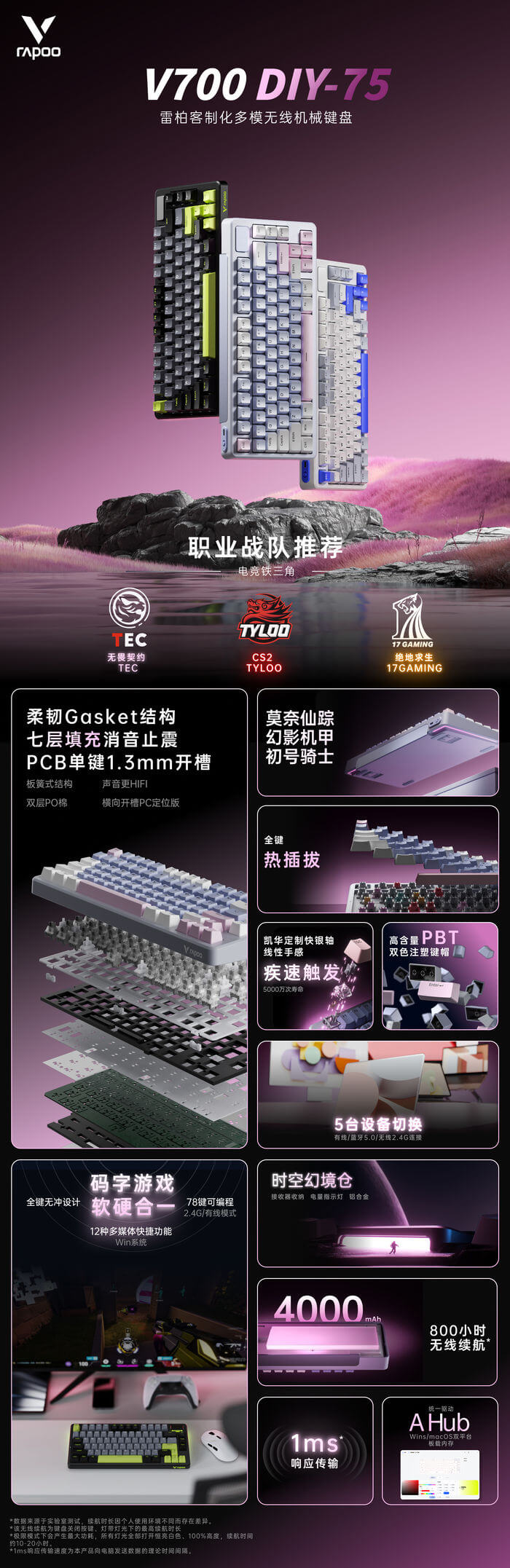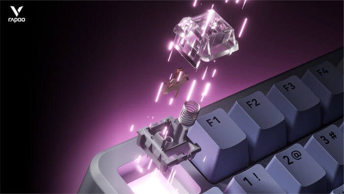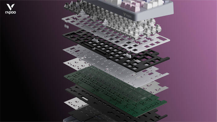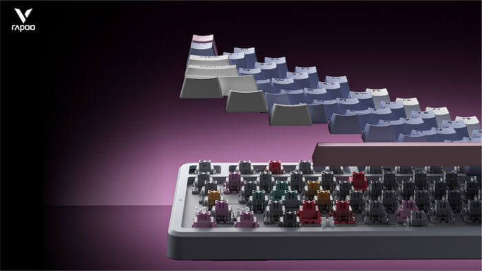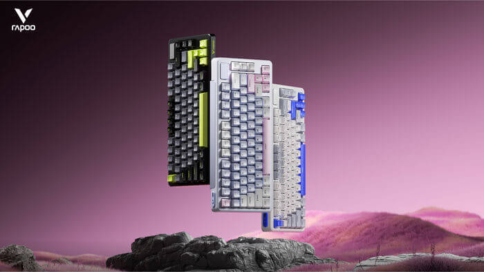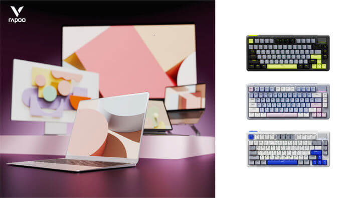 Rapoo định nghĩa lại không gian bàn phím nhỏ với V700DIY-75, bố cục 75% gọn gàng nhưng vẫn đủ phím mũi tên và cụm chức năng. Ba phối màu theo concept “Soft-living”: