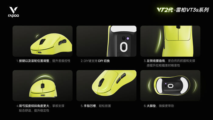 Rapoo kế thừa form VT3 quen thuộc, tinh chỉnh mạnh cho bàn tay nhỏ-vừa: lưng dốc ôm sát, eo trái thu gọn tăng độ chính xác khi flick, loại bỏ nút DPI thừa. Ba màu cá tính: 炽光黄 (Vivid Yellow) bùng nổ dopamine, 星空黑 (Starry Black) lịch lãm, 皎月白 (Moon White) nhã nhặn.