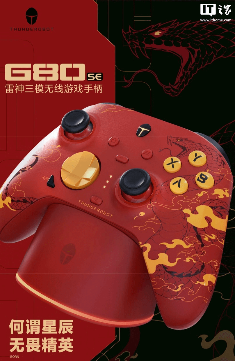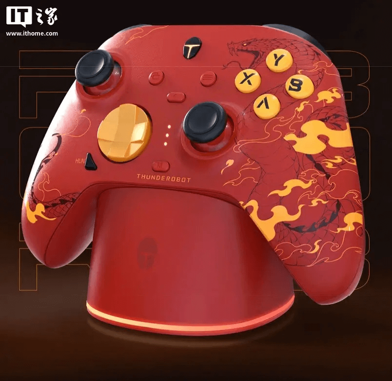 Thunderobot G80 SE khoác lên mình tông trắng–đỏ lấy cảm hứng từ họa tiết Trung Hoa hiện đại. Nắp mặt trước cố định bằng nam châm, dễ dàng tháo lắp để thay shell hoặc vệ sinh. Dock sạc RGB đi kèm có cảm biến nâng tay cầm tự động đánh thức.