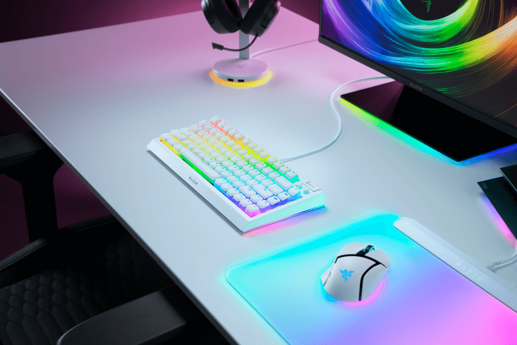 Hai dải underglow viền hông kết hợp per-key RGB đặc trưng, đồng bộ với 300+ game & phần mềm qua Razer Chroma Studio. Người chơi có thể tạo layer ánh sáng riêng hoặc để hiệu ứng ingame tự “nhảy” theo kỹ năng.