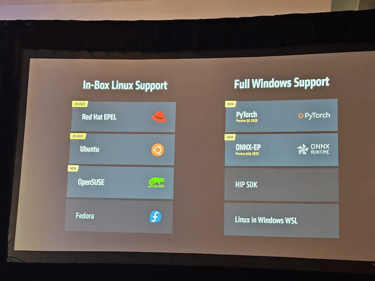 Hỗ trợ Windows: từ quý III/2025, PyTorch bản preview sẽ chạy ROCm trên Windows; ONNX-EP cập nhật ngay tháng 7. Đây là đòn phản công trực diện vào “thành trì” CUDA, mở đường để mọi GPU Radeon, APU Ryzen AI, Ryzen AI Max hay Threadripper đều tham gia hệ sinh thái AI PC.