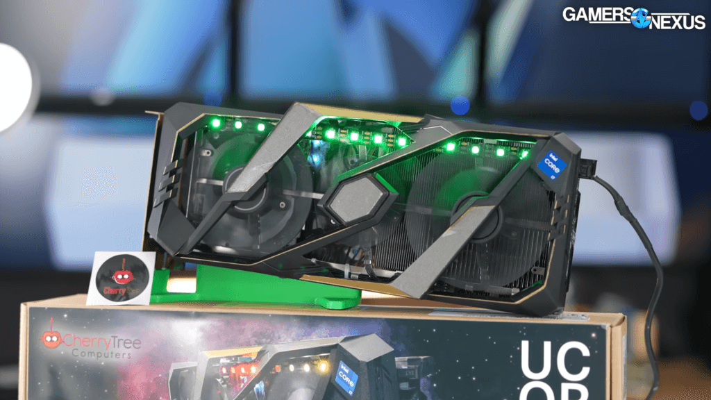 Gamers Nexus đo được điểm Cinebench tương đương mini-PC i7-1360P tiêu chuẩn. Nhiệt độ CPU giữ quanh 85 °C nhờ quạt 3-fan lớn. Dĩ nhiên, không còn GPU – card chỉ đóng vai “case” độc lạ.